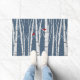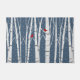Paar van rode kardinalen in een berkenboom met sneeuwvlokken op een sterrenblauwe achtergrond.