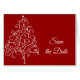 Plaats een feestelijke toon voor uw aanstaande nieuwkomers van december met het elegante Rode KerstboomWinter Wedding sparen het Wenskaart van de Aankondiging van de Datum. De buitenachtergrondkleur van de kaart is ook aanpasbaar zodat kunt u het veranderen om uw trouwkleuren aan te passen, indien gewenst. Dit stijlvolle winterhuwelijk houdt de datum-aankondiging-kaart voorzien van een ingewikkeld wit ontwerp van de kerstboom op een rode achtergrond.