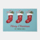 Destei's oorspronkelijke illustratie van feestelijke rode kerstkousen met twee snoepjes die er uit komen. De achtergrondkleur is blauw. Er zijn ook twee personalizable tekstgebieden.