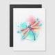 Rood, vliegend, artistiek getekend, in felle kleuren met textuur iriserende, blauwe vleugels op witte achtergrond, geschilderd met spetters waterverf verf. Felrode libel.
