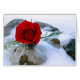 Een mooie rode roos op stenen bedekt met ijs en sneeuw.