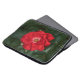 Een foto van een rode roos in een tuin. De bloesem is volledig open en laat de gele stengels van het centrum zien. Een paar rode knoppen groeien achter de hoofdbloem. De achtergrond is vol met groene bladeren. Afbeelding Copyright ©Kimberly J Tilley.