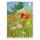 Een blanco briefkaart met een bloemige waterverf van een rode en roze papaver bloementuin in de buurt van een witte hek met een mooi uitzicht en groene bomen op de achtergrond.