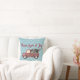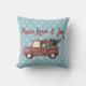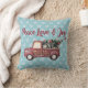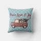 Een kussen met een afbeelding van een schattige kleine speelgoed truck met Merry Christmas hand geschilderd aan de zijkant. Met een versierde kerstboom achterin. Tekst: Vrede, liefde en vreugde. Stel op een blauw en wit sneeuwvlok patroon.