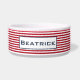 Rode strepen op een witte achtergrond met aangepast monogram in schreefloos lettertype op een witte rechthoek met dunne marineblauwe rand