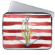 Deze laptophoes is een artistiek ontwerp met een nautisch thema en heeft een kleurrijk rood strempatroon in geverfde waterverf lijnen. Een blauw anker met een zeepaardje en oceaanplant voegt de aantrekkingskracht van de kust en het strand toe aan het ontwerp. Pas de tekst sjabloon met jouw naam, monogram initialen, of andere gewenste tekst aan.