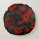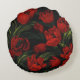 16-inch rond werpen kussen met een afbeelding mooie diepe rode tulpen en groene bladeren op zwart. Zie bijbehorend 20 x 20 inch wielkussen. Zie het volledige collectie van de Dag van de Moeder in de DECOR | Afdeling Kussens