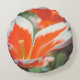 Rond kussen met een bloemthema met een foto van een lentetuin. We zien grote rode tulpen op een donkergroene achtergrond. Geef een vleugje natuurlijke schoonheid aan je leefruimte, voeg een charmant accent toe aan je interieur of vind een stijlvol cadeau voor een speciale gelegenheid!