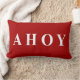 Elegante, moderne en trendy strand of kustbedekking rood en witte zeiling of boot design lumbar of gooi kussens of kussens met een rode achtergrond en witte tekst of typografie "Ahoy" aan de ene zijde en rode en witte strepen aan de andere zijde. Dit hedendaagse elegante ontwerp zal elk huis, strandhuis, slaapkamer, sofa, woonkamer, kantoor of boot verbeteren.