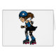 Een geweldige digitale cartoon van een Roller Girl die blauw draagt en de stoorpositie speelt terwijl ze over het spoor huilt. Haar lange haar stroomt achter haar terwijl haar roze wielen op haar quadskaten draaien.