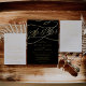 Deze romantische gouden folie zwarte monogram bruiloft is perfect voor een eenvoudige bruiloft. Het moderne klassieke ontwerp is voorzien van fancy draden en grillen met prachtige elegante folie met handschrift gestempelde typografie op een zwarte achtergrond.