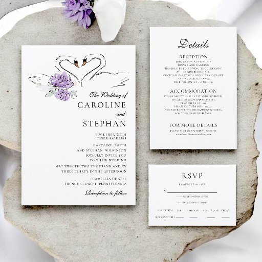 Celebrate your special day with these elegant wedding stickers featuring a romantic pair of swans forming a heart. Delicate purple floral accents add a touch of whimsical charm. Perfect for sealing envelopes, decorating favors, or adding a personal touch to your wedding stationery. These stickers capture the timeless symbol of love and commitment, making them an ideal choice for your wedding celebration. Let these beautiful swan stickers be a sweet reminder of your union.