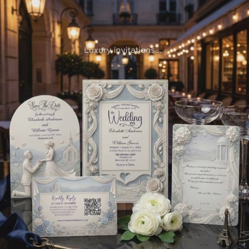 Maak uw tijdloze liefdesverhaal bekend met een elegante, traditionele esthetiek met een prachtig stoffig blauw en crèmekleurig palet voor uw formele viering.Deze vormgeving toont een klassieke romantische esthetiek, gecentreerd rond een prachtig geïllustreerd motief van een koppel waarbij een huwelijksaanzoek wordt gedaan. De visuele hiërarchie leidt het oog van de delicate bloemrijke hoekranden - samengesteld uit rozen, madeliefjes en botanische bladeren - naar beneden naar een man die op één knie zit met een ring voor een vrouw in een elegante jurk. De achtergrond toont een klassieke kapel en kasseienpad tegen glooiende heuvels, allemaal weergegeven in een crèmekleurige en off-white basis met stoffig blauwe accenten. De lay-out balanceert formele navyblauwe kalligraf