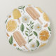 Voeg een verfrissende twist toe aan je interieur met dit charmante ronde kussen met handgetekende citroenlolly's, citruspartjes, madeliefjes en groene bladeren.