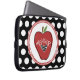 Een hoesje voor elektronica voor leerkrachten met een afbeelding van een rode appel met een zwarte rand, een zwart hart met witte polka stippen en een witte tekst met "TEACHER". De achtergrond is zwart met witte poka punten.