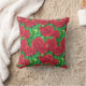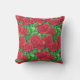 Sierkussen in een patroon van waterverf rozen, in tinten van diep karmozijnrood tot roos rood, tegen een achtergrond van groene bladeren