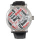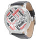 Een leuk kleurrijk horlogegezicht ontworpen met rood en zwart Thank You geschreven in verschillende talen en een verscheidenheid aan letterstijlen over wit met de lederen band. Klik op Aanpassen! om een andere achtergrondkleur dan wit te selecteren onder Bewerken en Achtergrond. Kies uit een veelheid van horlogebanden "Stijlen" en "Kleuren" onder Opties.