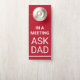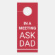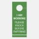 Niet storen deur hanger voor een ouder werken vanuit huis. Aan de ene kant, "in een vergadering - vraag het aan papa" in witte tekst tegen een rode achtergrond. Aan de andere kant, "Ik ben aan het werk - klop voordat je binnenkomt" in witte tekst tegen een groene achtergrond.