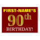 Dit ontwerp van het verjaardagsontwerp kenmerkt een bericht zoals de 90ste BIRTHDAY van de "EERSTE-NAAM!", met "90th"met een faux/imitatie gouden-als kleurenverschijning. De naam van de ontvanger op de voorzijde kan worden aangepast, en de voorachtergrond is rood. Het kenmerkt ook een gepersonaliseerd bericht van de verjaardagsgroet op de binnenkant. Een dergelijk verjaardagscadeau kan misschien aan iemand gegeven worden ter gelegenheid van zijn negentigste verjaardag. [~Z0000184]