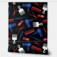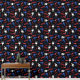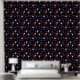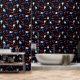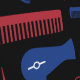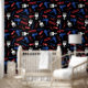 Haarsalonbehang met een rood, wit en blauw patroon van verschillende kappersgereedschappen, zoals scharen, kammen, haardrogers, haartrimmers tegen een zwarte achtergrond. Kappersgereedschap behang in rood, wit, blauw en zwart voor uw kapsalon. Barber wallpaper met kapsel tools en kapsel tools in rood, wit en blauw tegen een zwarte achtergrond