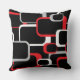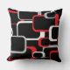 Een ontwerp van retro geïnspireerde vierkanten in rood, wit en grijs tegen een zwarte achtergrond op een werpkussen.