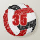 Dit ronde kussen met een meisjesvolleybalthema heeft het realistische afbeelding van een rood, zwart en wit volleybal met een wit motief van doedelbloemen, veren en paislies die de rode en zwarte panelen van het volleybal bedekken - personaliseer met de naam van de atleet en het monogram of de verscheidenheid op de voorkant en het jersey-nummer op de achterkant - door katz_d_zynes