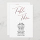 Dit eenvoudige, elegante ontwerp kenmerkt "Lijst Drie"die in een modern handschrift wordt teruggegeven en met een faux-metallisch goudeffect van het roos in reliëf wordt gemaakt. Het lettertype voor namen kan worden gewijzigd als u dat wenst. Zoals de achtergrondkleur. De details zullen op zowel voor als rug verschijnen. // 151