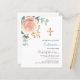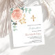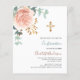 Roos gouden en blozend roze bloemstukken, eucalyptus groen en een gouden kruis. Personaliseer en voeg een naam en details toe. 1 vel = 1 uitnodiging afgedrukt rand tot rand.