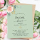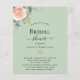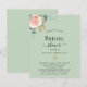 Een trendy salie groene achtergrond. Versierd met een rozen gouden en blozend roze bloemblaadje, rozen bloemblaadjes en groene watergekleurde eucalyptusbladeren, takjes, groen en een nepgouden tak. Personaliseer en voeg de naam van de bruid toe om te zijn en feestdetails. 1 vel = 1 uitnodiging afgedrukt rand tot rand.