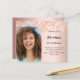 Voeg uw eigen foto met verticale afmetingen toe. Een boogvormig foto-lijst. Een rozen gouden gradiënt achtergrondkleur. Versierd met confetti. Personaliseer en voeg een naam en partijgegevens toe. 1 vel = 1 uitnodiging bedrukt rand tot rand.