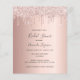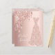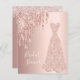 Elegante, klassieke, glamoureuze en girly stijl bruids douche uitnodiging. Een rozen gouden jurk en druppels. Roos gouden achtergrond. Met de tekst: Vrijgezellenfeest op de voorkant geschreven met een modern wit geletterd handschrift. Voeg uw gebeurtenisgegevens toe aan zwarte, donkergrijze gekleurde letters.