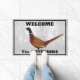 Een mooie roosterfazant wordt op een gevlekte achtergrond van bomen geplaatst.