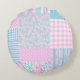 Een ronde piloot of kussen, met een faux patchwork-patroon van Lipstick roze rozen en kleine witte Butterflies op een Turquoise Blue-achtergrond, voorzien van passende pooldots, Check Ginghams en Stripes. Als onderdeel van het collectie 'Summer Days' in Posh & Painterly, kan dit patroon gemakkelijk worden aangepast aan elke Pillow of Cushion.