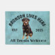 Rottweiler Gepersonaliseerd Hondenliefhebber welkom model. Deze welkome mat kan met de naam van uw hond worden gepersonaliseerd, kan de slogan ook worden veranderd of u kon een afbeelding van uw eigen hond gebruiken (zorg ervoor het transparant is). Bronson leeft hier... Alle behandelings verwelkomen uitgeven het ontwerp om doopvont, kleuren en achtergrondkleur te veranderen. Het maakt een prachtig cadeau voor een huisopwarmingsfeest, feestdagen, hondenliefhebbers en zo vaak als het maar gebeurt.