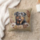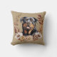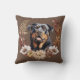 Een prachtig portret van een majestueuze Rottweiler-hond wordt in het midden van een herfstkrans geplaatst in tinten van kaneelbruin, bruin en crème. Het ontwerp van de hond en krans wordt op een lichtere bruine achtergrond geplaatst. Beide zijden van het kussen hebben hetzelfde afbeelding, maar de achterzijde heeft een donkerbruine achtergrond.