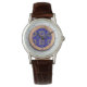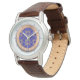 Dit prachtige horloge is elegant ingericht met een subtiel geometrisch patroon van gebeeldhouwd en in reliëf gemaakt hout in een centrale cirkel. De achtergrond van de cirkel in koningsblauw versterkt het zeer fijne kantwerk en is omgeven door een houten kroon. U kunt een zeer delicaat afdrukken van uw initialen aanpassen, geschreven in een verfijnd blauw lettertype aan de onderkant van de kroon. Een subtiel schaduw/licht spel geeft de illusie dat het centrale stuk van dit horloge in reliëf is. De hoofdachtergrond blijft wit en toont dunne kleine blauwe markeringen voor de uurnummers.