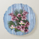 Roze Arty Flowers op Blue-wood-texture Rond Kussen