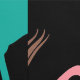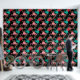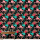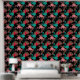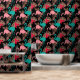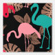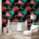 Kleurrijk patroon met flamingo's in roze en blauw omgeven door tropische planten tegen een zwarte achtergrond.