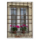 Twee potten hete roze bloemen op een vensterrand achter ijzeren balken.