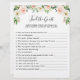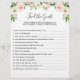 Een leuk baby shower spel, "Find the Guest" nodigt uw douchegasten uit om andere gasten te ontmoeten om antwoorden te krijgen op een lijst met vragen over hen. Het dient als een geweldige ijsbreker in het krijgen van uw douche gasten om te communiceren met elkaar en elkaar te leren kennen. Dit spelblad is verfraaid met blush roze bloemenboeketten en groen om te passen bij de andere items in dit zoete baby showers collectie.