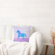 Een kussen met een waterverf paard in blauw en paarse kleuren. Running wild en vrij. Zet op een paarse gestreepte achtergrond met een flair. Een blauw-roze waterverf rand gelaagd over de bodem.