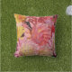 Hier is een mooie decoratieve buitenkussen met een collectie waterlievendahlia bloesems in een kleurrijk pastel abstract patroon van roze, oranje en geel. Het afbeelding wordt op de achterkant herhaald.