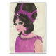 Een potloodschets van een zestiger vrouw, watergekleurd met een roze paarse jurk, oorringen, ketting en lint die door haar haar lopen.