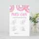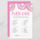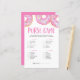 Controleer je portemonnee voor de objecten in de lijst. De persoon met de meeste punten is de winnaar! | Voeg deze leuke "Wat in je tas"-spelkaart toe aan je baby shower. Dit baby shower trivia-gamekaart is voorzien van roze waterverf donuts met kleurrijke sproinkles. Personaliseer door namen, gebeurtenis en datum toe te voegen. Dit roze donuts paardenspel is perfect voor elk seizoen of elk thema van het baby shower.