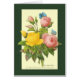 Antieke reproductie van prachtig roze en geel rozen botanisch kunstwerk van de bekende kunstenaar Pierre Redoute met kleine blauwe vlinders. De bloemen zijn vermeld op het kunstwerk; Perzische gele rozen (rosa Lutea) en roze theerozen (rosa indica). Tegen een jachtgroene achtergrond met een namaak canvas textuurpatroon. Klik op 'Aanpassen' om uw lettertypen te kiezen en voeg tekst en meer toe, sla uw ontwerp zelfs op voor later.