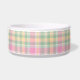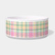 Stijlvolle hondenschaal gemaakt in witte keramiek en een afbeelding van een roze, geel, wit en lichtgroen gelaatvormig patroon, rond de kom. De roze douanetekst, in het midden, is klaar om voor uw pooch te personaliseren. Een geweldig cadeauidee voor iedereen met een huisdier komt in twee maten.