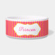 Deze gepersonaliseerde hotroze en oranje strepen patroonkom voor uw geperste puppy heeft een helder wit labelgebied dat u kunt aanpassen aan de naam van uw huisdier. Als je hulp nodig hebt, stuur dan een e-mail naar niteowlstudio@gmail.com.