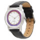 Een horloge met een fancy en elegant ontwerp. De achtergrond bestaat uit roze en paarse mousserende glitteredelstenen. Trendy en feminine vibe. Een cirkel met een faux-goudfolie rand bovenaan met jouw naam binnenin.