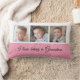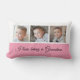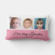 Cadeauidee, foto-collage kussen. Voeg uw eigen foto's aan dit Sierkussen, Lumbar Pillow, kussen toe en verander de tekst als u verkiest. Zes foto's staan op deze kussen, drie aan de voorkant en nog drie aan de achterkant. In de getoonde steekproef is de formulering "Ik hou van grootmoeder zijn" hetzelfde voor- en achteraan, maar u hebt de mogelijkheid om beide naar eigen keuze te wijzigen. Roze en wit met zwarte tekst.
