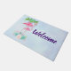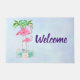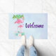 Leuke welkomstdeurmat met een illustratie van een mama en baby roze flamingo die op een bed van bloemensucculente bloemen staat met groene palmbomen die in de rug zwaaien. Tropisch en . De achtergrond is een zomerse lichtblauwe waterverf met hints van paarse.